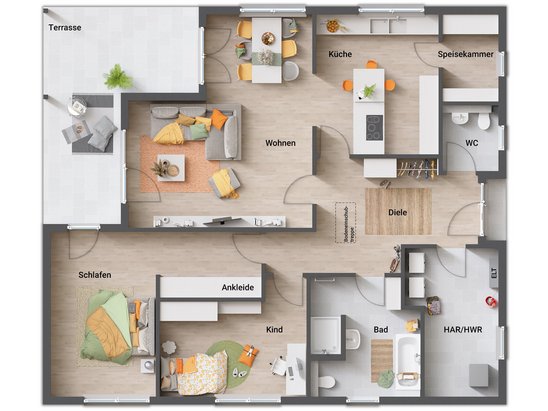 Stufenloses Wohnglück im Winkelbungalow 108: charmantes Design, variabler Grundriss, helle Räume und direkter Zugang zur Terrasse. Jetzt anfragen und das Leben auf einer Ebene genießen!