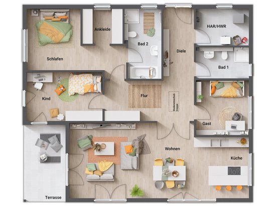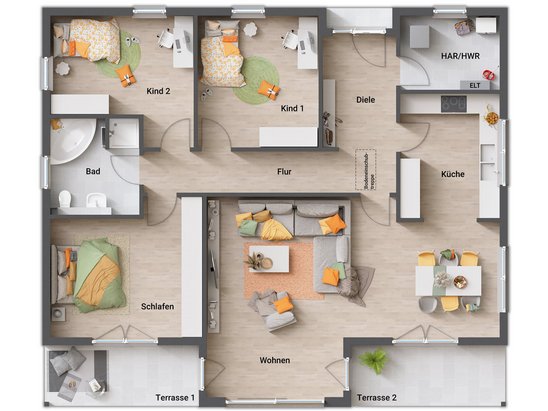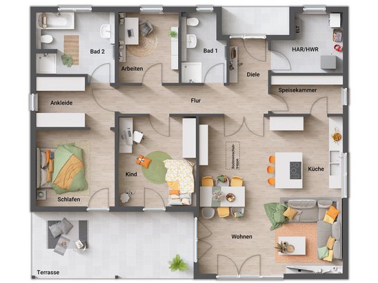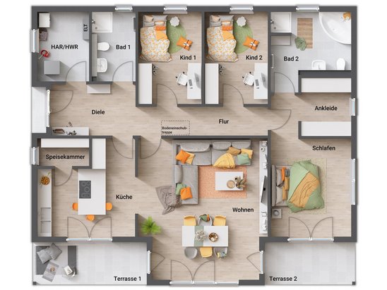 ab Preis1 €Abbildungen enthalten Sonderwünsche die nicht Vertragsbestandteil sind, regionale Preis- und Ausstattungsänderungen möglich. Schlüsselfertig im Sinne dieses Angebotes bedeutet: ohne Tapezier- und Teppichverlegearbeiten.