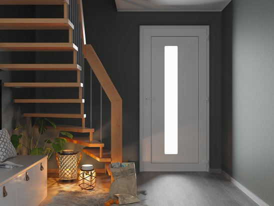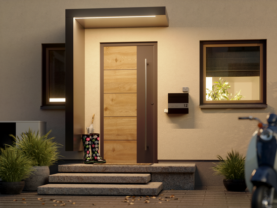 Die vollständige Haustür ist standardmäßig mit oder ohne Seitenteil sowie mit Türglas, Türgriffen und Drückergarnitur erhältlich.