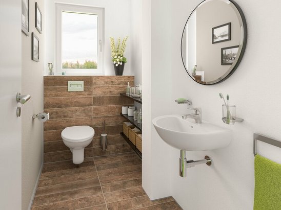 Im Gäste-WC sind standardmäßig ein Waschtisch mit Armatur, eine WC-Anlage mit WC-Sitz, eine Betätigungsplatte sowie Wand- und Bodenfliesen enthalten.