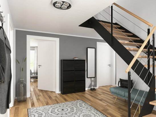 Zusätzlich zur Bodeneinschubtreppe ist auch eine Innentreppe, wahlweise als Wangentreppe, Zweiholmtreppe oder Systemtreppe, im Kaufpreis des Massivhauses enthalten.