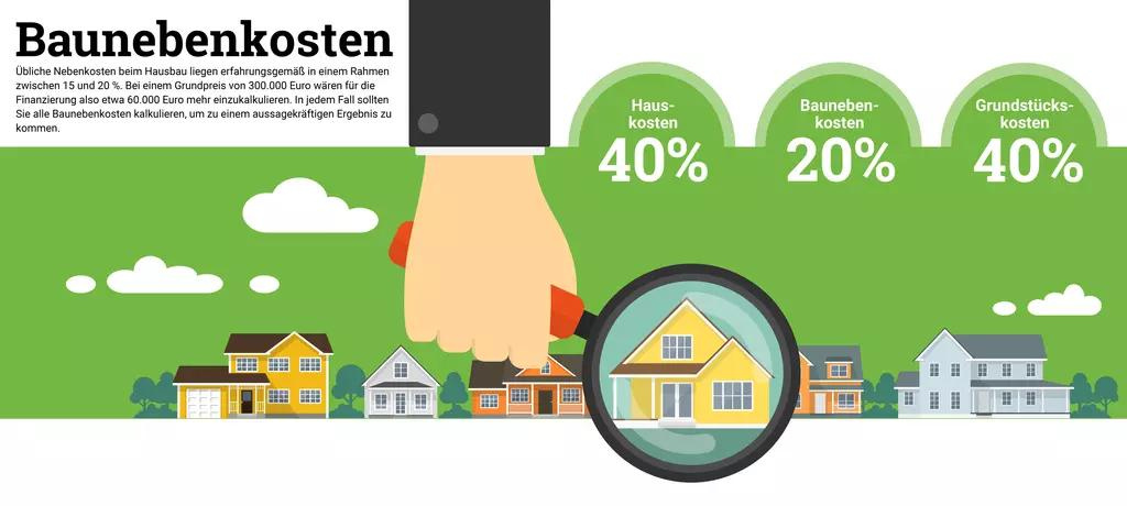 Die Baunebenkosten setzen sich aus verschiedenen Posten zusammen. Dazu zählen zum einen die Kaufnebenkosten wie Grunderwerbsteuer, Notar- und Grundbuchkosten sowie gegebenenfalls Maklergebühren, und zum anderen die Baunebenkosten, die während und nach dem Bau anfallen. Die Kaufnebenkosten vor dem Bau sollten idealerweise durch Eigenkapital gedeckt werden und werden nur bei einer Vollfinanzierung vollständig berücksichtigt.