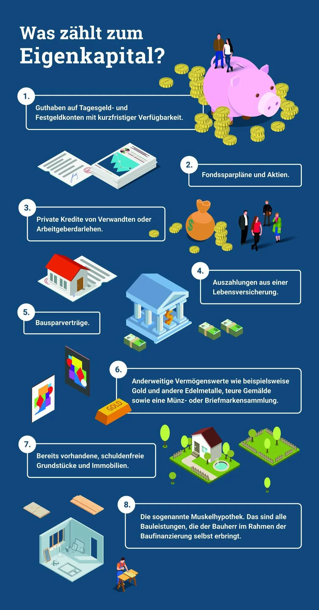 Eigenkapital umfasst in der Regel Ersparnisse, kann aber auch Bausparverträge und andere Vermögenswerte umfassen. Welche Werte Ihre Bank als Eigenkapital anerkennt, erfahren Sie hier.